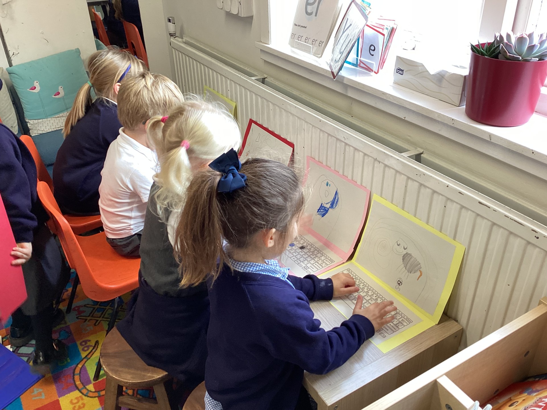 We talked about internet safety and what that looked like in our school and homes. The children were able to share their understanding about needing an adult to ‘keep an eye’ on what they were doing, and to check 'nothing flashes up’ on the screen. During 'Learning Adventure Time', lots of children made their own laptops and role-played themselves using the computers and asking if they can go on their favourite games and websites.