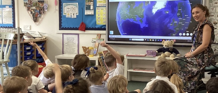 Using Google Earth, we located Chewton Mendip village, and the city of Wells as we scrolled in and out on the computer. We identified our classroom, outside area and swimming pool on the map as we zoomed in, and some children were able to talk about us living on an island as we zoomed out and could see the United Kingdom surrounded by water. It led to lots of interesting discussions about where we each live and how many of us have swimming lessons at Wells Leisure Centre (which we saw on the map!).