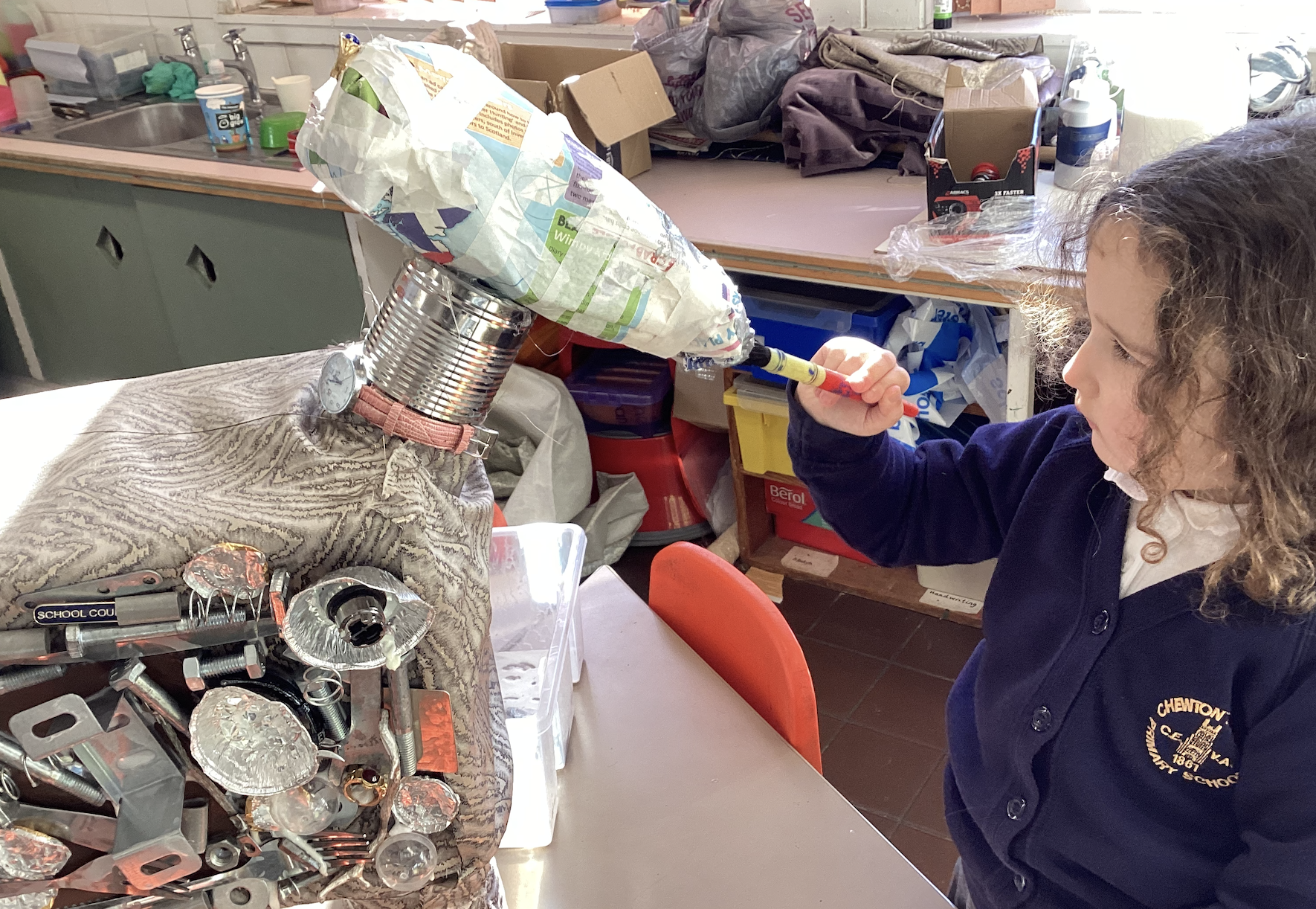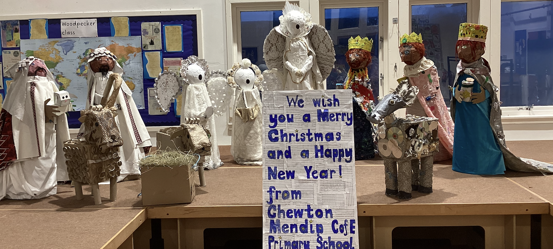 This links to the Eco Arts Competition that Bishop's Palace organised, and we entered. We used recycled materials to add texture and patterns as we created 3D sculptures. The theme was Christmas Carols and the whole school contributed sculptures of characters from Christmas carols, singing their own carol! The children in Robin class made a donkey, from the carol, Little Donkey. It was made from recycled boxes and crisp tubes, along with disused metalware that was donated by parents. They used plenty of glue to attach old trinkets, costume jewellery, nuts and screws onto the donkey, adding texture and interest to the design. We used Robert Bradford and Karen Hurley as our artist inspiration. Robert Bradfors uses recycled materials to create interesting pieces of art. Chewton Mendip won the Creative Interpretation of the Theme category!