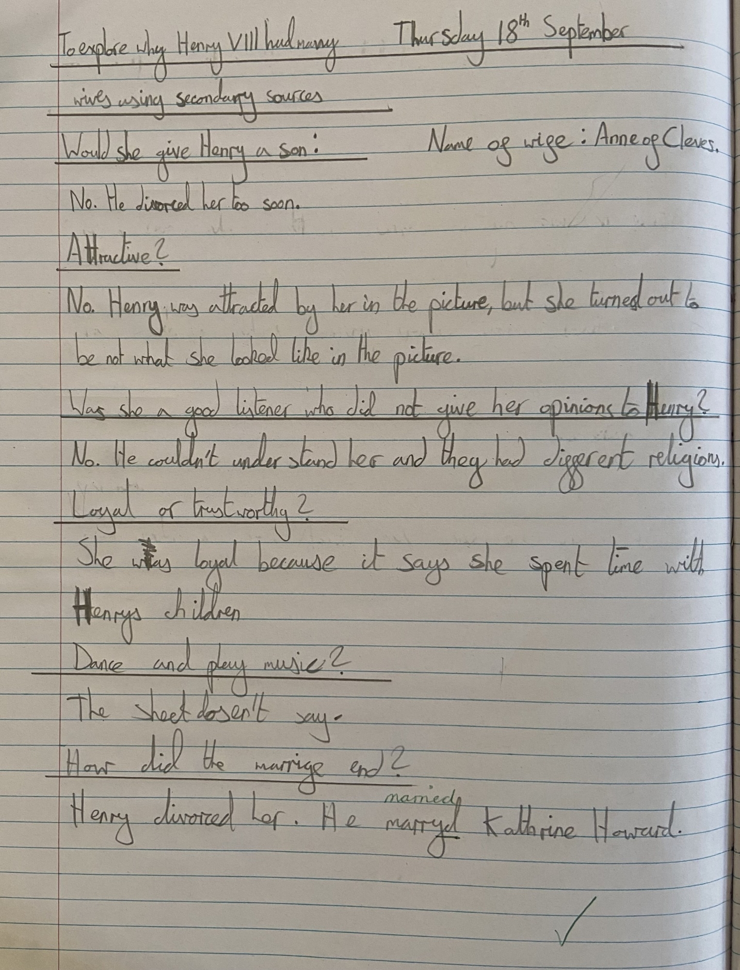 This term's History topic is: What was life like in Tudor England? We have thoroughly enjoyed learning all about Henry VIII and all his wives! We've used primary sources, including pictures drawn at the time, to interpret whether Henry was a fair ruler or a tyrant; investigated what Henry was looking for in a wife; and made deductions about Anne Boleyn using letters and pictures.