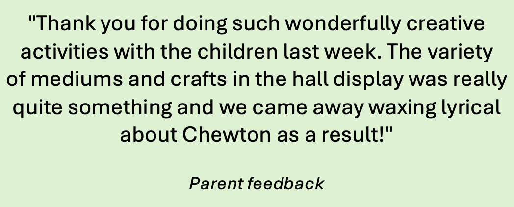 To enrich our art curriculum, all pupils are invited to attend a lunchtime art club during the year, where they can practise their skills and experiment with new techniques. We also offer an after-school art club, run by local artist Sally Wetherall, which pupils can choose to join. Each year, we celebrate Art Week — a dedicated time for pupils to explore art in greater depth and broaden their cultural horizons. During the week, we welcome local artists into school to work with the children and organise visits to nearby art galleries. The week concludes with our very own art exhibition, planned and curated by the pupils, where they proudly showcase their work to families.