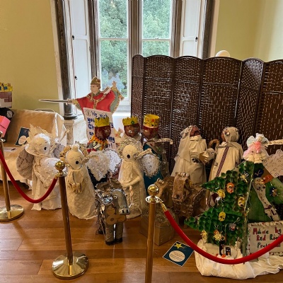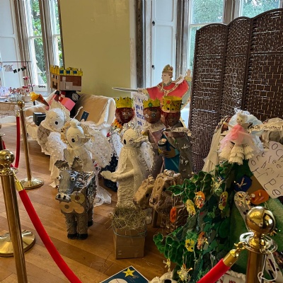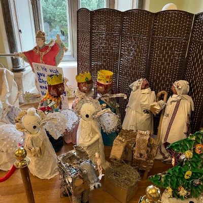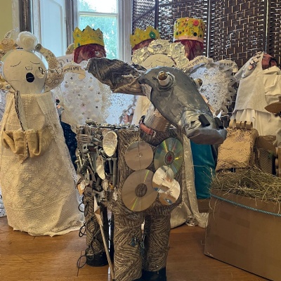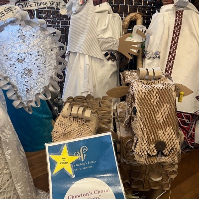 Bishop's Palace, in Wells, invited us to take part in their Eco Art Christmas competition this year. The theme was 'Christmas Carols'. After much discussion, and many ideas, we decided to create a scene that was made up of 3D structures. Each sculpture would be a character from a well-known Christmas Carol, and each character would be singing their own carol... but together!
