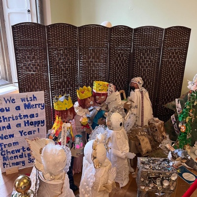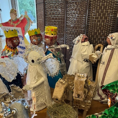 Buzzard class designed and made shepherds and sheep from 'While shepherds watched their flocks'. Woodpecker class created three kings, from 'We Three Kings'. Owl class produced angels from 'Hark the herald angels sing'. Robin class made a donkey, from 'Little donkey', and we invited Red Room pre-school to join us, and they created a Christmas tree, from 'Oh Christmas Tree'.