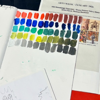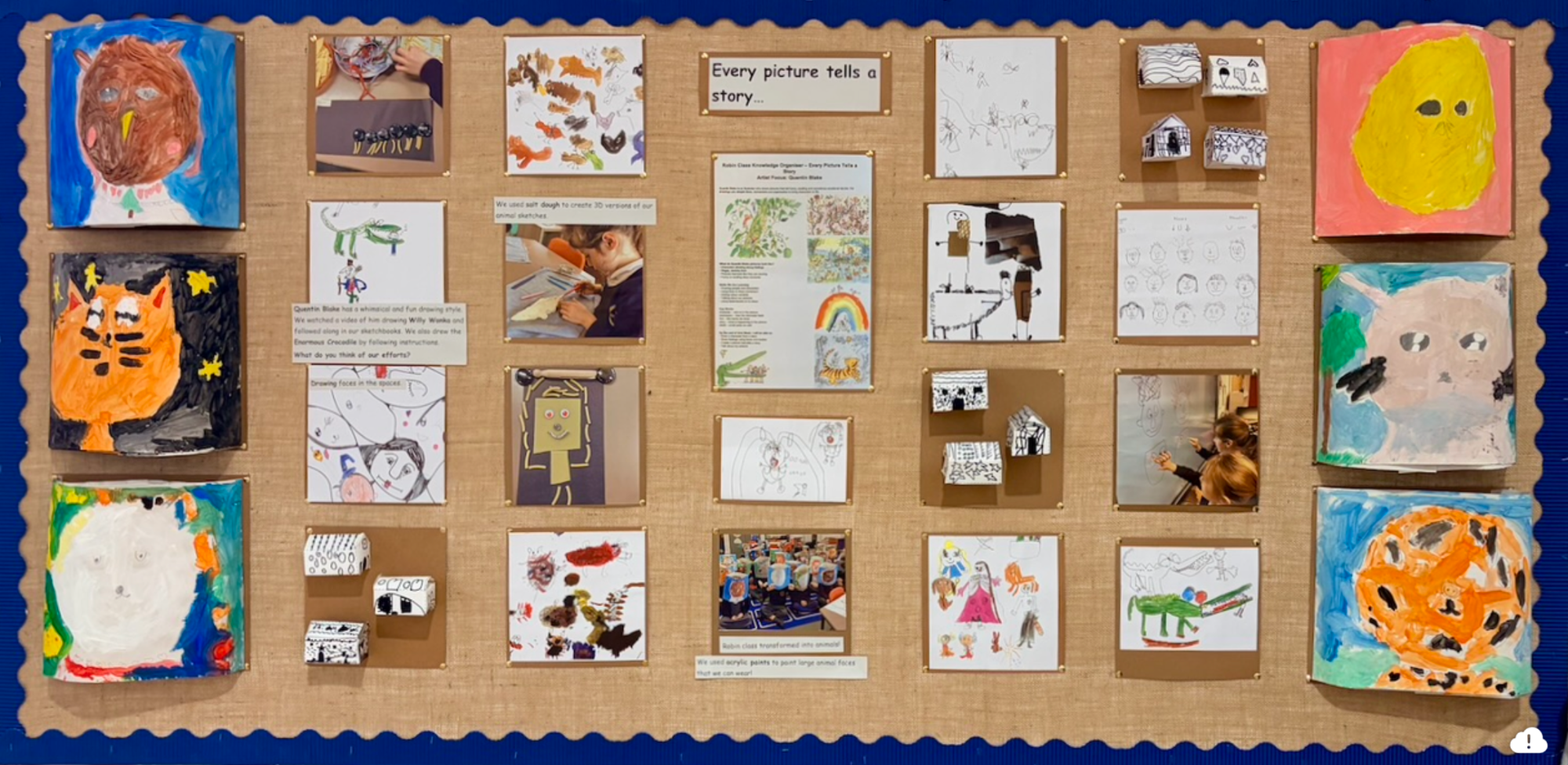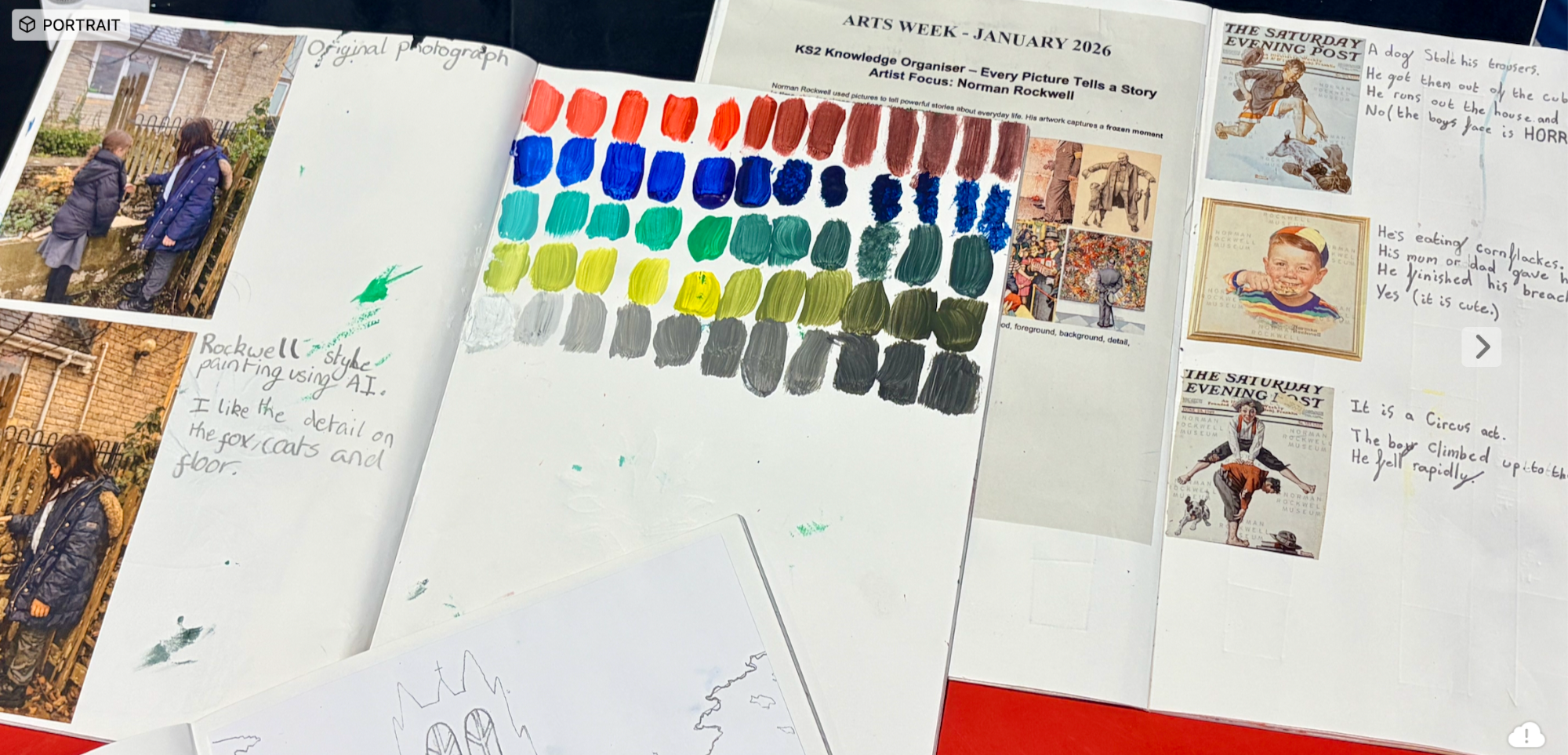 Our Arts Enrichment Week created an excitable buzz across the whole school. With a strong focus on developing skills and techniques, pupils worked predominantly in their sketchbooks before progressing to create final mixed-media pieces. The week began by learning about and responding to well-known artists, helping us explore our theme: “Every Picture Tells a Story.”