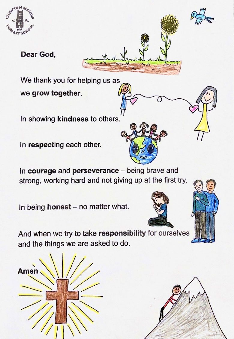 Our whole school came together during a series of collective worship sessions to write our new school prayer. It focusses on the importance of our school values. The children then illustrated our prayer to display in each of our reflective areas in the classrooms.
